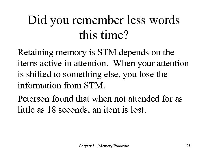 Did you remember less words this time? Retaining memory is STM depends on the items active in attention. When your attention is shifted to something else, you lose the information from STM. Peterson found that when not attended for as little as 18 seconds, an item is lost. Chapter 5 – Memory Processes 25