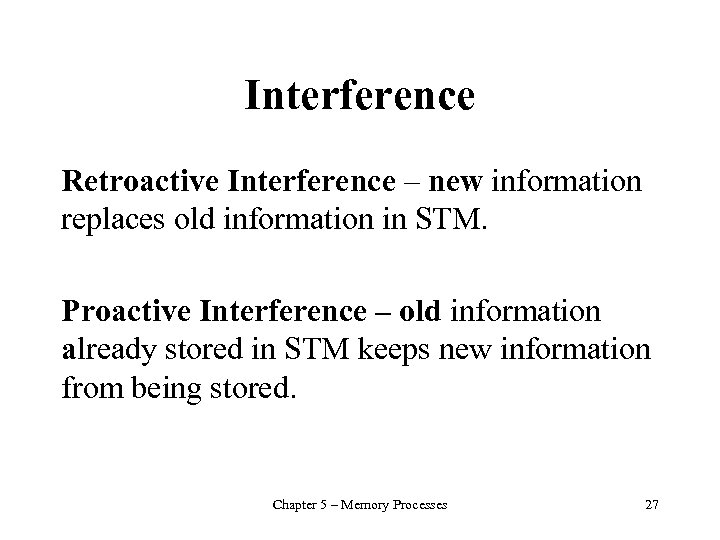Interference Retroactive Interference – new information replaces old information in STM. Proactive Interference – old information already stored in STM keeps new information from being stored. Chapter 5 – Memory Processes 27