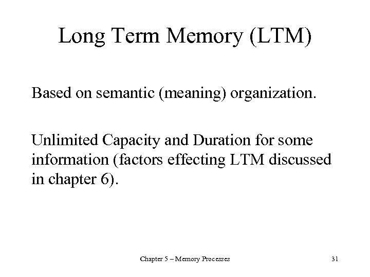 Long Term Memory (LTM) Based on semantic (meaning) organization. Unlimited Capacity and Duration for some information (factors effecting LTM discussed in chapter 6). Chapter 5 – Memory Processes 31