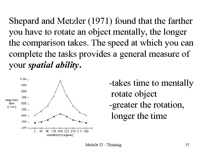 Shepard and Metzler (1971) found that the farther you have to rotate an object mentally, the longer the comparison takes. The speed at which you can complete the tasks provides a general measure of your spatial ability. -takes time to mentally rotate object -greater the rotation, longer the time Module 27 - Thinking 57