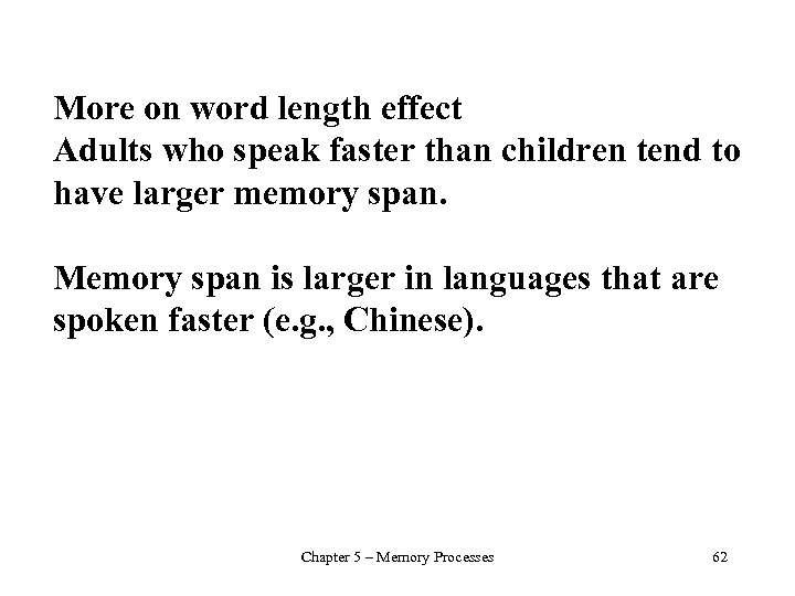 Word Length Effect – Longer words (with more syllables) show lower recall rates than shorter words. 1 syllable words = 80% recall 5 syllable words = 30% recall Interpreted as a time limited loop. Not number of items but how long it takes to pronounce them. Chapter 5 – Memory Processes 61
