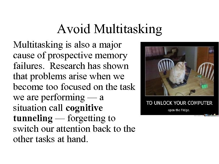 Avoid Multitasking is also a major cause of prospective memory failures. Research has shown that problems arise when we become too focused on the task we are performing — a situation call cognitive tunneling — forgetting to switch our attention back to the other tasks at hand.