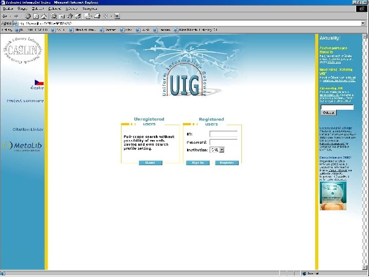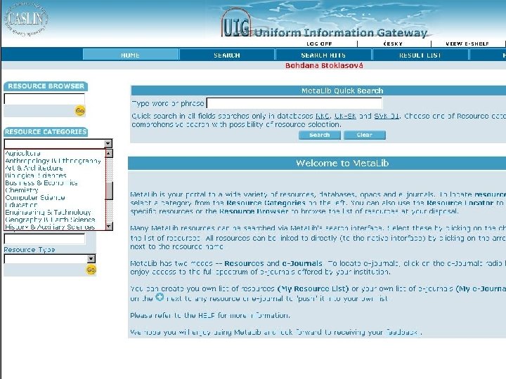 The Uniform Information Gateway Project - goals 1. 2. 3. 4. To integrate and provide qualitatively new access to heterogeneous information resources: integrated access to information on documents and to the primary documents themselves; uniform user-friendly interface; uniform query input and display of results; merge and de-duplication of results, authentication and authorization-based services; configuration of a personalized environment, including a list of frequently accessed resources and a personal cataloguing area with a possibility of changing the format; save queries and results options; no need for repeated logins and logouts (single sign-in to the array of resources); extended services for holding status, full texts, abstract, electronic document delivery and ILL, information on authors; related documents according to the subject and title. Collection level description and collection development: unified, clear, standardized and internationally accepted description of resources available in the Czech Republic (i. e. “thematic map”); co-operation in collection development and sharing. Subject access transformation: national authorities – subjects; English equivalents, DDC-UDC concordance tables. Czech National Subject Gateway: creating of uniform guidelines for Czech subject gateways building based on international standards; distributing of responsibilities for covering particular subject; national co-ordination – strongly connected with 1. , 2. , 3