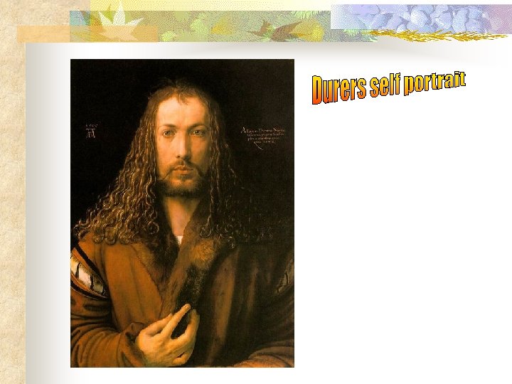 Renaissance Artist outside Italy 1. He was the son of a Hungarian goldsmith based in Nuremberg in southern Germany but after 3 years studying his fathers trade he decided to become a painter 2. He became an apprentice at the age of 15 and learnt painting and wood and copper engraving skills. 3. He did engravings in wood called Woodcuts, which were then inked over and used to illustrate books. 4. With the help of a mirror he painted a self- portrait, the first done by a Renaissance artist.