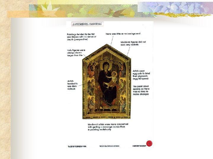 Medieval artists painted on canvas instead of wood n n They used oil paints which dried slowly and allowed artists change their work. They used strong bright colours