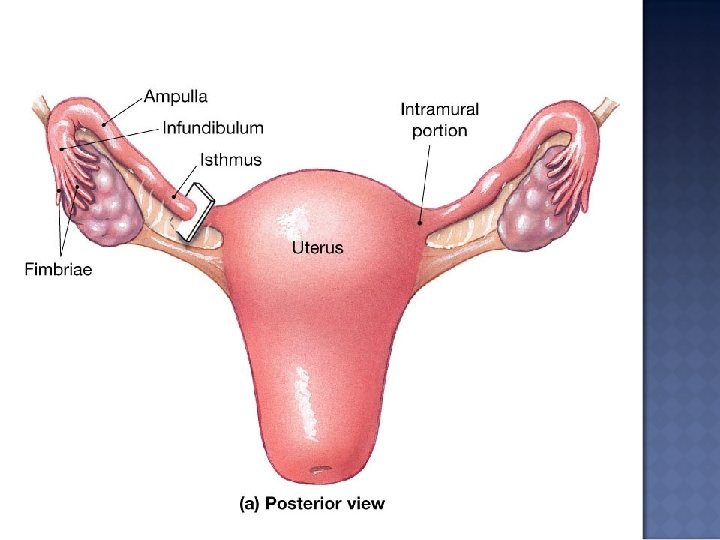 Hollow muscular tubes divided in to three segments: 1. the Infundibulum: the end closest to the ovaries with finger-like projections called fimbriae. 2. The Ampulla: Located in the middle of the uterine tube, has smooth muscle layers 3. The Isthmus: A short segment connected to the uterine wall The Uterine tubes provide a nutrient-rich environment that contains lipids and glycogen which is essential for a developing embryo.