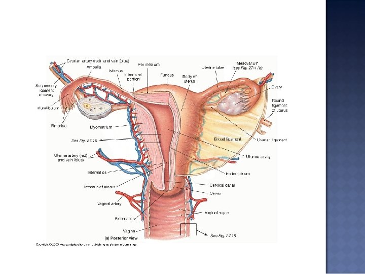 The Ovaries are located on the lateral walls of the pelvic cavity Their three functions include: 1. Production of immature female gametes or oocytes 2. Secretion of female sex hormones (estrogens and progestins) 3. Secretion of inbulin and feedback control of FSH Oogenisis- Ovum production; Begins at the woman’s birth and accelerates during puberty and ends at menopause.
