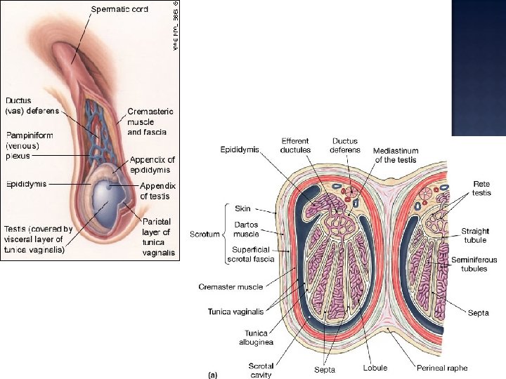 • • The decent of the testes through the inguinal canals occur during fetal development. The testes remain connected to the internal structures via the spermatic cords. The raphe marks the boundary between the two chambers in the scrotum. The dartos muscle tightens the scrotum, giving it a wrinkled apperance as it elevates the testes; the cremaster muscles are ore substantial muscles that pull the testes close to the body. The tunica albuginea surrounds each testis. Septa extends from the tunics albuginea to the region of the testis closet to the entrance to the epididymis, creating a series of lobules. Seminiferous tubules within each lobule are the sites of sperm production. From there, spermatozoa pass through the rete testis. Efferent ductules connect the rete testis to the epipdidymis. Between the seminferous tubules are interstitial cells, which secrete sex hormones.