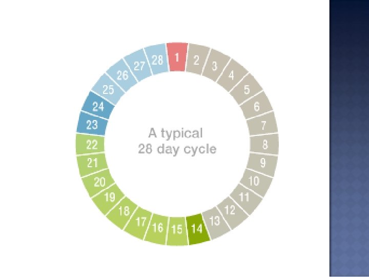 Menstrual Cycles The average menstrual cycle is 28 to 32 days. Some women have longer or shorter cycles, so the exact timing of ovulation can vary. Here's an overview of a typical 28 -day menstrual cycle. Day 1 Your cycle begins on the first day of blood flow. Days 2 -14 Follicular Phase The follicles on your ovary become active, and your cervical mucus starts to thin. Day 14 Ovulation occurs mid-cycle, but can vary from between Day 11 and Day 21 of a woman's cycle. Rising estrogen levels trigger the LH surge, which causes the follicle to ovulate and release an egg. It's important to chart your basal body temperature and LH surge so you know when you ovulate. Days 15 -22 Luteal Phase After releasing the egg, the follicle produces progesterone, which thickens the lining of the uterus for implantation. Days 23 to 24 Implantation of a fertilized egg can take place. At this point, hormones produced by pregnancy may be detected by a pregnancy test. Days 25 to 28 If pregnancy does not occur, your hormone levels begin to fall. The uterine lining sheds, resulting in your period.