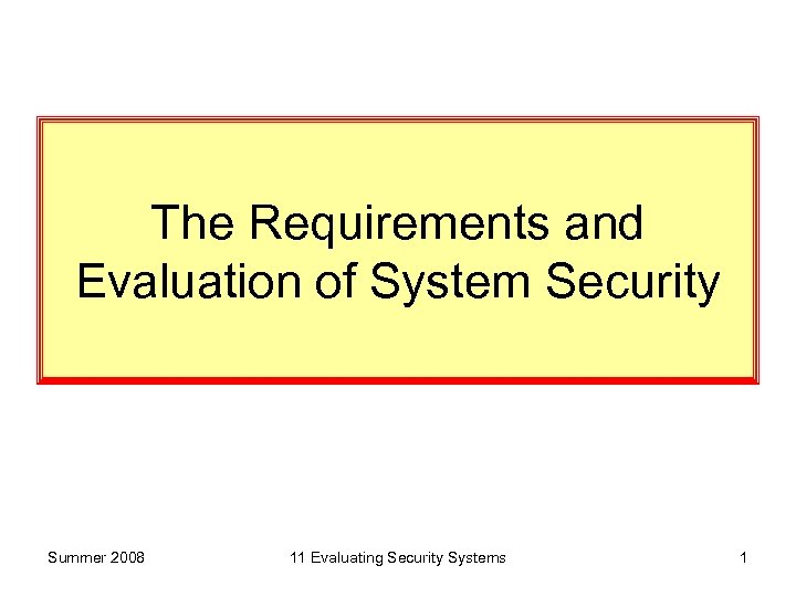 The Requirements and Evaluation of System Security Summer 2008 11 Evaluating Security Systems 1