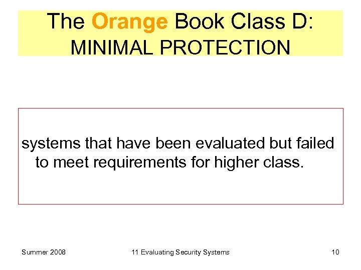 The Orange Book Class D: MINIMAL PROTECTION systems that have been evaluated but failed to meet requirements for higher class. Summer 2008 11 Evaluating Security Systems 10