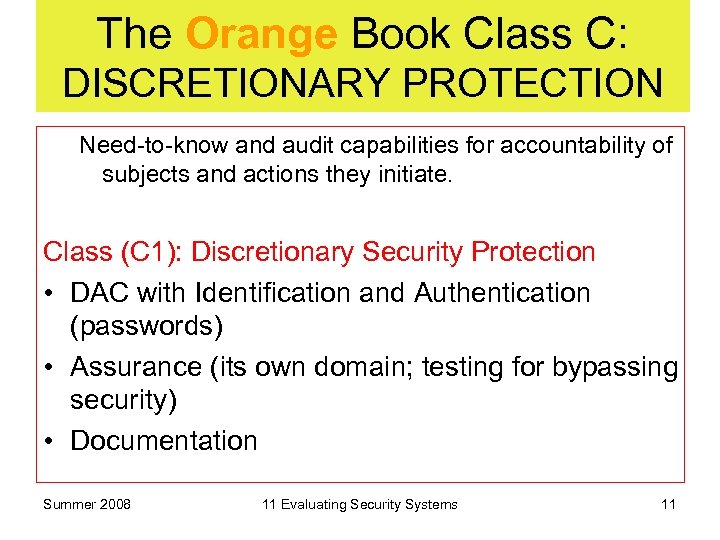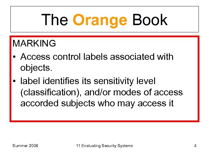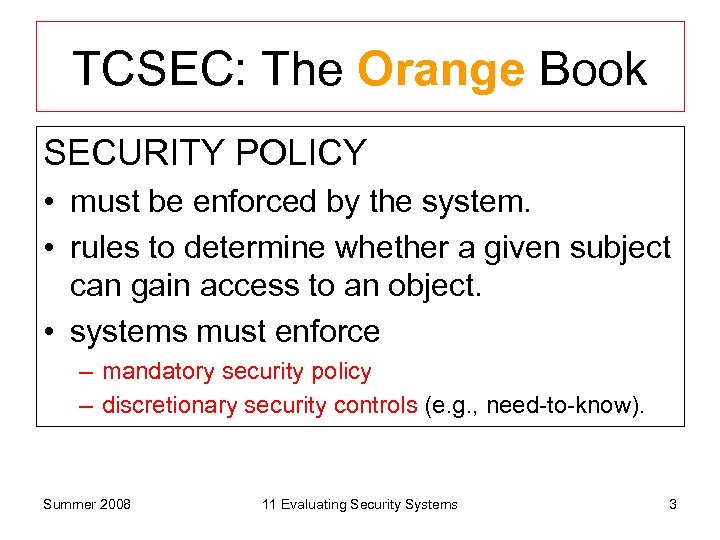 TCSEC: The Orange Book SECURITY POLICY • must be enforced by the system. • rules to determine whether a given subject can gain access to an object. • systems must enforce – mandatory security policy – discretionary security controls (e. g. , need-to-know). Summer 2008 11 Evaluating Security Systems 3