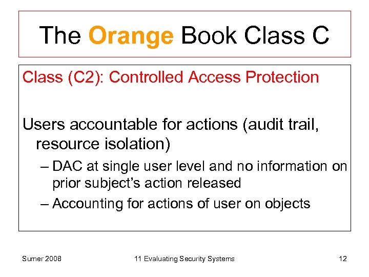 The Orange Book Class C Class (C 2): Controlled Access Protection Users accountable for actions (audit trail, resource isolation) – DAC at single user level and no information on prior subject’s action released – Accounting for actions of user on objects Sumer 2008 11 Evaluating Security Systems 12