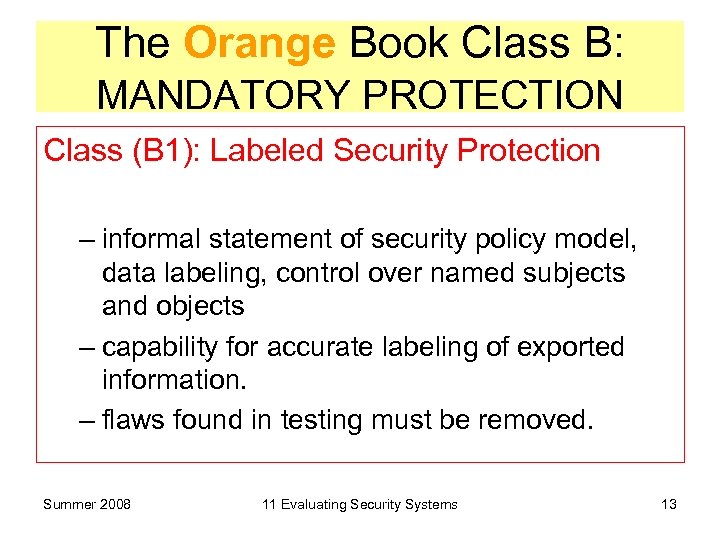 The Orange Book Class B: MANDATORY PROTECTION Class (B 1): Labeled Security Protection – informal statement of security policy model, data labeling, control over named subjects and objects – capability for accurate labeling of exported information. – flaws found in testing must be removed. Summer 2008 11 Evaluating Security Systems 13