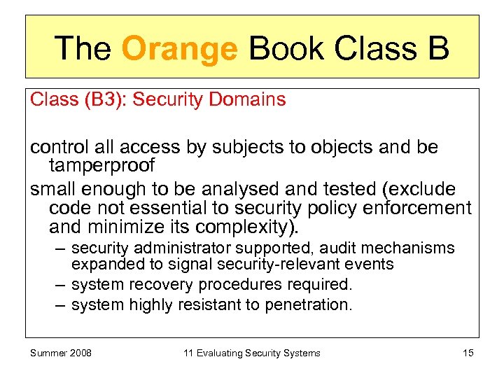 The Orange Book Class B Class (B 2): Structured Protection Clearly defined / documented policy model DAC and MAC Covert channels addressed. Structured into protection-critical and non-critical elements. TCB interface well-defined and design / implementation allow thorough testing Authentication mechanisms strengthened, trusted facility management – system administrator and operator functions, – stringent configuration management controls. Relatively resistant to penetration. Summer 2008 11 Evaluating Security Systems 14