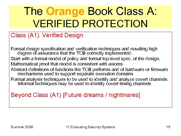 The Orange Book Class B Class (B 3): Security Domains control all access by subjects to objects and be tamperproof small enough to be analysed and tested (exclude code not essential to security policy enforcement and minimize its complexity). – security administrator supported, audit mechanisms expanded to signal security-relevant events – system recovery procedures required. – system highly resistant to penetration. Summer 2008 11 Evaluating Security Systems 15