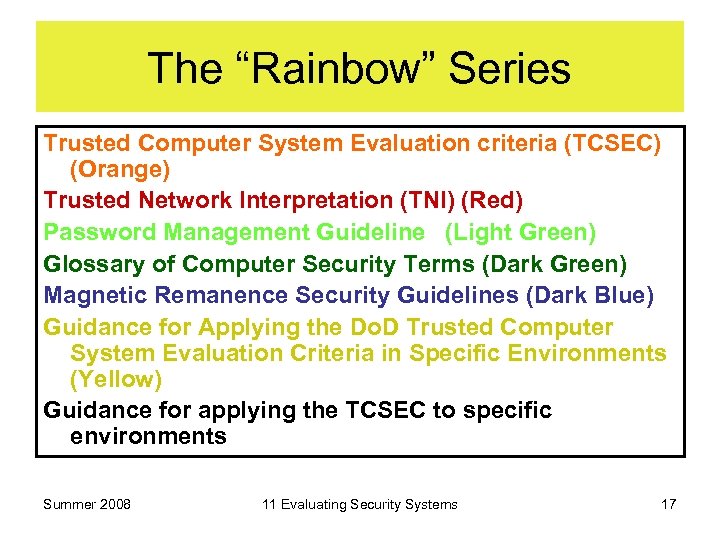The “Rainbow” Series Trusted Computer System Evaluation criteria (TCSEC) (Orange) Trusted Network Interpretation (TNI) (Red) Password Management Guideline (Light Green) Glossary of Computer Security Terms (Dark Green) Magnetic Remanence Security Guidelines (Dark Blue) Guidance for Applying the Do. D Trusted Computer System Evaluation Criteria in Specific Environments (Yellow) Guidance for applying the TCSEC to specific environments Summer 2008 11 Evaluating Security Systems 17
