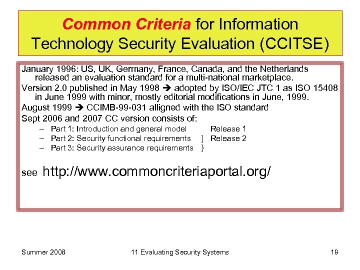 Common Criteria for Information Technology Security Evaluation (CCITSE) January 1996: US, UK, Germany, France, Canada, and the Netherlands released an evaluation standard for a multi-national marketplace. Version 2. 0 published in May 1998 adopted by ISO/IEC JTC 1 as ISO 15408 in June 1999 with minor, mostly editorial modifications in June, 1999. August 1999 CCIMB-99 -031 alligned with the ISO standard Sept 2006 and 2007 CC version consists of: – Part 1: Introduction and general model Release 1 – Part 2: Security functional requirements ] Release 2 – Part 3: Security assurance requirements } see http: //www. commoncriteriaportal. org/ Summer 2008 11 Evaluating Security Systems 19