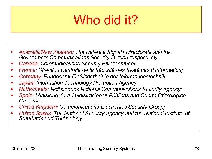 Who did it? • • • Australia/New Zealand: The Defence Signals Directorate and the Government Communications Security Bureau respectively; Canada: Communications Security Establishment; France: Direction Centrale de la Sécurité des Systèmes d'Information; Germany: Bundesamt für Sicherheit in der Informationstechnik; Japan: Information Technology Promotion Agency Netherlands: Netherlands National Communications Security Agency; Spain: Ministerio de Administraciones Públicas and Centro Criptológico Nacional; United Kingdom: Communications-Electronics Security Group; United States: The National Security Agency and the National Institute of Standards and Technology. Summer 2008 11 Evaluating Security Systems 20