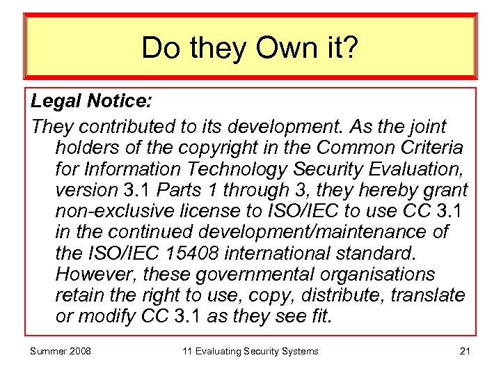 Do they Own it? Legal Notice: They contributed to its development. As the joint holders of the copyright in the Common Criteria for Information Technology Security Evaluation, version 3. 1 Parts 1 through 3, they hereby grant non-exclusive license to ISO/IEC to use CC 3. 1 in the continued development/maintenance of the ISO/IEC 15408 international standard. However, these governmental organisations retain the right to use, copy, distribute, translate or modify CC 3. 1 as they see fit. Summer 2008 11 Evaluating Security Systems 21