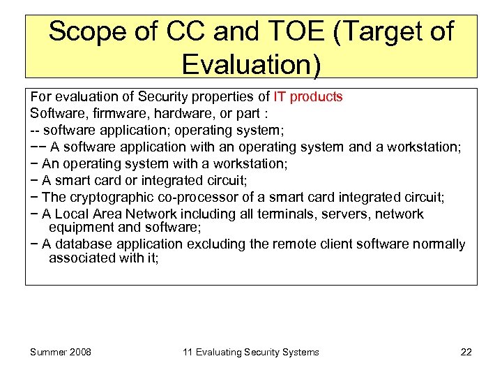 Scope of CC and TOE (Target of Evaluation) For evaluation of Security properties of IT products Software, firmware, hardware, or part : -- software application; operating system; −− A software application with an operating system and a workstation; − An operating system with a workstation; − A smart card or integrated circuit; − The cryptographic co-processor of a smart card integrated circuit; − A Local Area Network including all terminals, servers, network equipment and software; − A database application excluding the remote client software normally associated with it; Summer 2008 11 Evaluating Security Systems 22