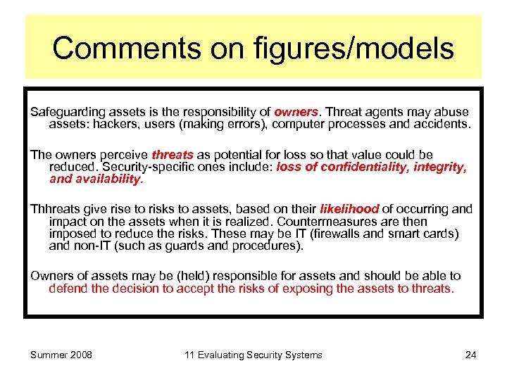 Comments on figures/models Safeguarding assets is the responsibility of owners. Threat agents may abuse assets: hackers, users (making errors), computer processes and accidents. The owners perceive threats as potential for loss so that value could be reduced. Security-specific ones include: loss of confidentiality, integrity, and availability. Thhreats give rise to risks to assets, based on their likelihood of occurring and impact on the assets when it is realized. Countermeasures are then imposed to reduce the risks. These may be IT (firewalls and smart cards) and non-IT (such as guards and procedures). Owners of assets may be (held) responsible for assets and should be able to defend the decision to accept the risks of exposing the assets to threats. Summer 2008 11 Evaluating Security Systems 24