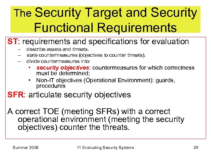 The Security Target and Security Functional Requirements ST: requirements and specifications for evaluation – – – describe assets and threats. state countermeasures (objectives to counter threats). divide countermeasures into: • security objectives: countermeasures for which correctness must be determined; • Non-IT objectives (Operational Environment): guards, procedures SFR: articulate security objectives A correct TOE (meeting SFRs) with a correct operational environment (meeting the security objectives) counter the threats. Summer 2008 11 Evaluating Security Systems 26