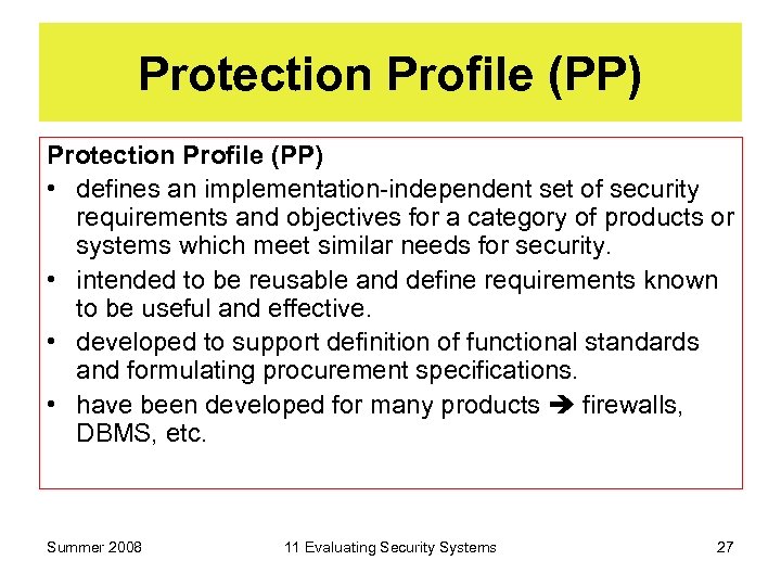 Protection Profile (PP) • defines an implementation-independent set of security requirements and objectives for a category of products or systems which meet similar needs for security. • intended to be reusable and define requirements known to be useful and effective. • developed to support definition of functional standards and formulating procurement specifications. • have been developed for many products firewalls, DBMS, etc. Summer 2008 11 Evaluating Security Systems 27