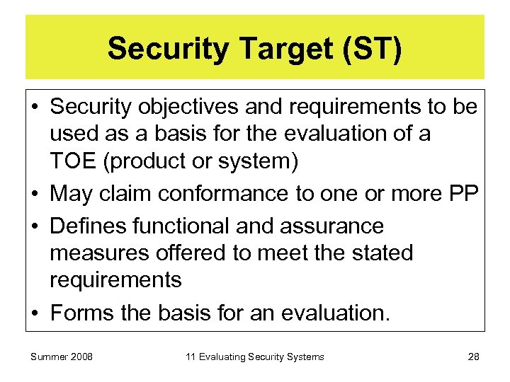 Security Target (ST) • Security objectives and requirements to be used as a basis for the evaluation of a TOE (product or system) • May claim conformance to one or more PP • Defines functional and assurance measures offered to meet the stated requirements • Forms the basis for an evaluation. Summer 2008 11 Evaluating Security Systems 28