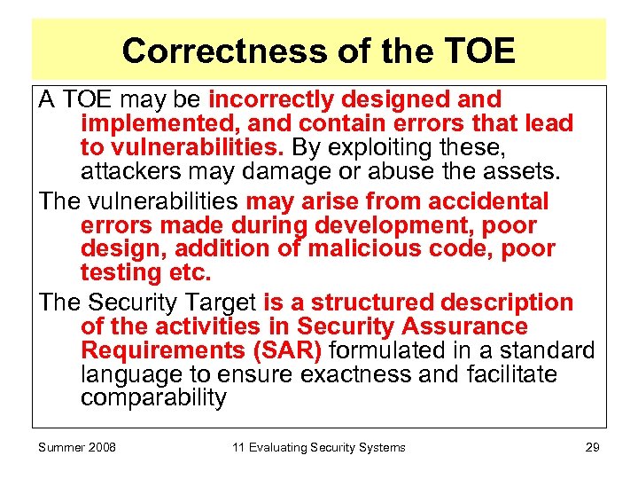 Correctness of the TOE A TOE may be incorrectly designed and implemented, and contain errors that lead to vulnerabilities. By exploiting these, attackers may damage or abuse the assets. The vulnerabilities may arise from accidental errors made during development, poor design, addition of malicious code, poor testing etc. The Security Target is a structured description of the activities in Security Assurance Requirements (SAR) formulated in a standard language to ensure exactness and facilitate comparability Summer 2008 11 Evaluating Security Systems 29