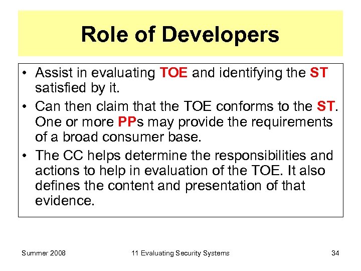 Role of Developers • Assist in evaluating TOE and identifying the ST satisfied by it. • Can then claim that the TOE conforms to the ST. One or more PPs may provide the requirements of a broad consumer base. • The CC helps determine the responsibilities and actions to help in evaluation of the TOE. It also defines the content and presentation of that evidence. Summer 2008 11 Evaluating Security Systems 34