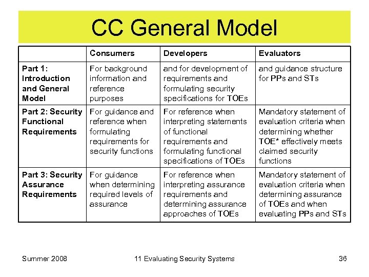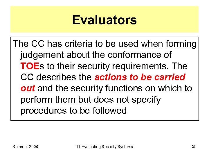 Evaluators The CC has criteria to be used when forming judgement about the conformance of TOEs to their security requirements. The CC describes the actions to be carried out and the security functions on which to perform them but does not specify procedures to be followed Summer 2008 11 Evaluating Security Systems 35