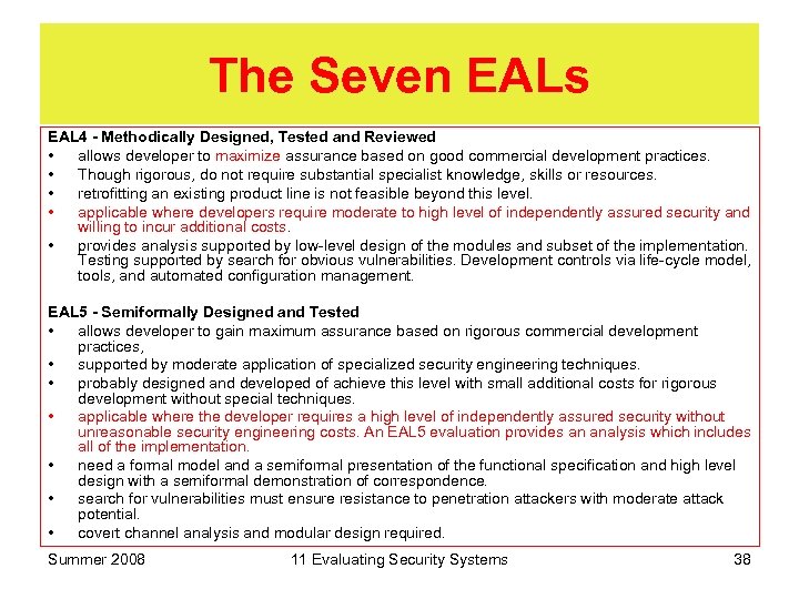 The Seven EALs EAL 1 - functionally tested • when confidence in correct operation is required, but threats are not viewed as serious. • when required to show care has been exercised in protection of personal information, etc. • provides evidence that TOE functions to documentation and provides protection. EAL 2 - Structurally Tested • developer must provide design information and test results. • effort is good commercial practices, so the impact on cost and time should be minimal. • when developers/users require a moderate level security without full development record EAL 3 - Methodically Tested and Checked • developer gains assurance from security engineering at the design stage. • applicable where a moderate level of independent assured security is required. • TOE and its development are investigated without incurring reengineering costs. • independent confirmation of developer test results, • evidence of a developer search for obvious vulnerabilities. • development environment controls and TOE configuration management required. Summer 2008 11 Evaluating Security Systems 37