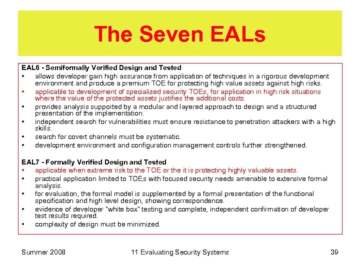 The Seven EALs EAL 4 - Methodically Designed, Tested and Reviewed • allows developer to maximize assurance based on good commercial development practices. • Though rigorous, do not require substantial specialist knowledge, skills or resources. • retrofitting an existing product line is not feasible beyond this level. • applicable where developers require moderate to high level of independently assured security and willing to incur additional costs. • provides analysis supported by low-level design of the modules and subset of the implementation. Testing supported by search for obvious vulnerabilities. Development controls via life-cycle model, tools, and automated configuration management. EAL 5 - Semiformally Designed and Tested • allows developer to gain maximum assurance based on rigorous commercial development practices, • supported by moderate application of specialized security engineering techniques. • probably designed and developed of achieve this level with small additional costs for rigorous development without special techniques. • applicable where the developer requires a high level of independently assured security without unreasonable security engineering costs. An EAL 5 evaluation provides an analysis which includes all of the implementation. • need a formal model and a semiformal presentation of the functional specification and high level design with a semiformal demonstration of correspondence. • search for vulnerabilities must ensure resistance to penetration attackers with moderate attack potential. • covert channel analysis and modular design required. Summer 2008 11 Evaluating Security Systems 38