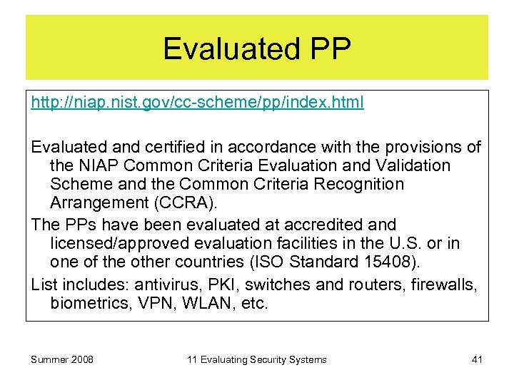 Evaluated PP http: //niap. nist. gov/cc-scheme/pp/index. html Evaluated and certified in accordance with the provisions of the NIAP Common Criteria Evaluation and Validation Scheme and the Common Criteria Recognition Arrangement (CCRA). The PPs have been evaluated at accredited and licensed/approved evaluation facilities in the U. S. or in one of the other countries (ISO Standard 15408). List includes: antivirus, PKI, switches and routers, firewalls, biometrics, VPN, WLAN, etc. Summer 2008 11 Evaluating Security Systems 41