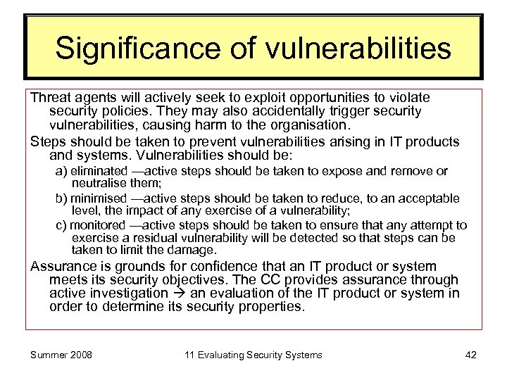 Significance of vulnerabilities Threat agents will actively seek to exploit opportunities to violate security policies. They may also accidentally trigger security vulnerabilities, causing harm to the organisation. Steps should be taken to prevent vulnerabilities arising in IT products and systems. Vulnerabilities should be: a) eliminated —active steps should be taken to expose and remove or neutralise them; b) minimised —active steps should be taken to reduce, to an acceptable level, the impact of any exercise of a vulnerability; c) monitored —active steps should be taken to ensure that any attempt to exercise a residual vulnerability will be detected so that steps can be taken to limit the damage. Assurance is grounds for confidence that an IT product or system meets its security objectives. The CC provides assurance through active investigation an evaluation of the IT product or system in order to determine its security properties. Summer 2008 11 Evaluating Security Systems 42