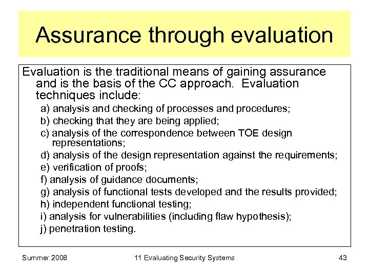 Assurance through evaluation Evaluation is the traditional means of gaining assurance and is the basis of the CC approach. Evaluation techniques include: a) analysis and checking of processes and procedures; b) checking that they are being applied; c) analysis of the correspondence between TOE design representations; d) analysis of the design representation against the requirements; e) verification of proofs; f) analysis of guidance documents; g) analysis of functional tests developed and the results provided; h) independent functional testing; i) analysis for vulnerabilities (including flaw hypothesis); j) penetration testing. Summer 2008 11 Evaluating Security Systems 43