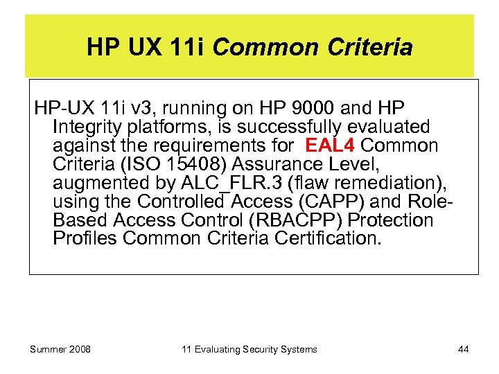 HP UX 11 i Common Criteria HP-UX 11 i v 3, running on HP 9000 and HP Integrity platforms, is successfully evaluated against the requirements for EAL 4 Common Criteria (ISO 15408) Assurance Level, augmented by ALC_FLR. 3 (flaw remediation), using the Controlled Access (CAPP) and Role. Based Access Control (RBACPP) Protection Profiles Common Criteria Certification. Summer 2008 11 Evaluating Security Systems 44