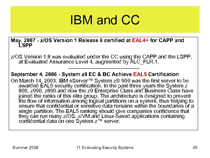 IBM and CC May, 2007 - z/OS Version 1 Release 8 certified at EAL 4+ for CAPP and LSPP z/OS Version 1. 8 was evaluated under the CC using the CAPP and the LSPP, at Evaluated Assurance Level 4, augmented by ALC_FLR. 1. --------------------- September 4, 2006 - System z 9 EC & BC Achieve EAL 5 Certification On March 14, 2003, IBM e. Server™ System z® 900 was the first server to be awarded EAL 5 security certification. In the past three years the System z 800, z 990, z 890 and now the z 9 Enterprise Class and Business Class have joined the ranks of this elite group. The architecture is designed to prevent the flow of information among logical partitions on a system, thus helping to ensure that confidential or sensitive data remains within the boundaries of a single partition. The EAL 5 ranking should give companies confidence that they can run many z/OS, z/VM and Linux-based applications containing confidential data on one System z™ server. Summer 2008 11 Evaluating Security Systems 45