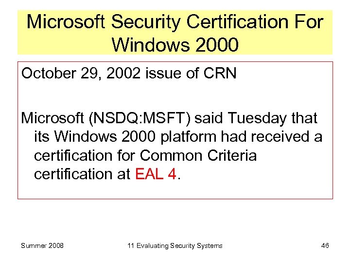 Microsoft Security Certification For Windows 2000 October 29, 2002 issue of CRN Microsoft (NSDQ: MSFT) said Tuesday that its Windows 2000 platform had received a certification for Common Criteria certification at EAL 4. Summer 2008 11 Evaluating Security Systems 46