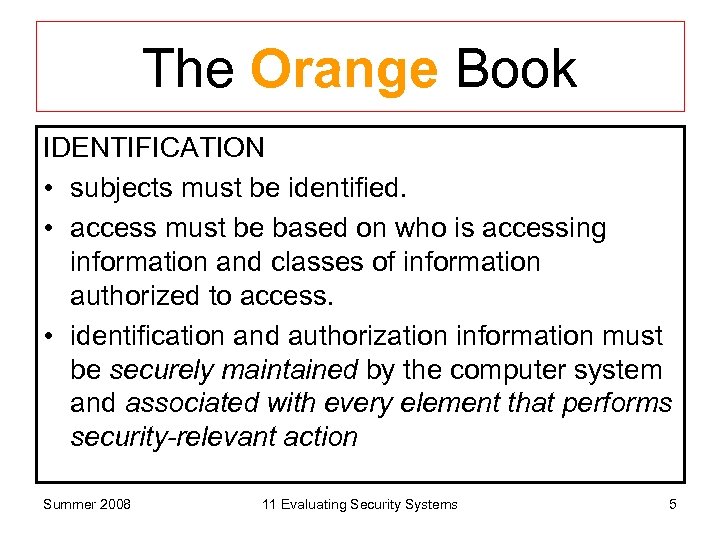 The Orange Book MARKING • Access control labels associated with objects. • label identifies its sensitivity level (classification), and/or modes of access accorded subjects who may access it Summer 2008 11 Evaluating Security Systems 4
