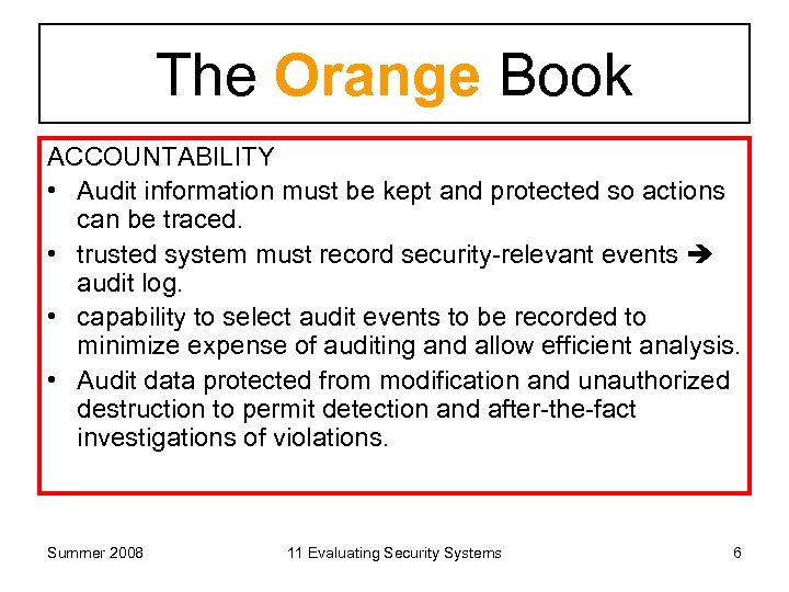 The Orange Book IDENTIFICATION • subjects must be identified. • access must be based on who is accessing information and classes of information authorized to access. • identification and authorization information must be securely maintained by the computer system and associated with every element that performs security-relevant action Summer 2008 11 Evaluating Security Systems 5