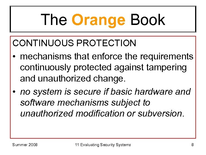 The Orange Book CONTINUOUS PROTECTION • mechanisms that enforce the requirements continuously protected against tampering and unauthorized change. • no system is secure if basic hardware and software mechanisms subject to unauthorized modification or subversion. Summer 2008 11 Evaluating Security Systems 8