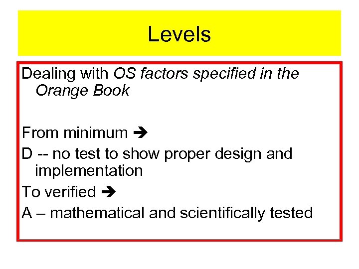 Levels Dealing with OS factors specified in the Orange Book From minimum D -- no test to show proper design and implementation To verified A – mathematical and scientifically tested