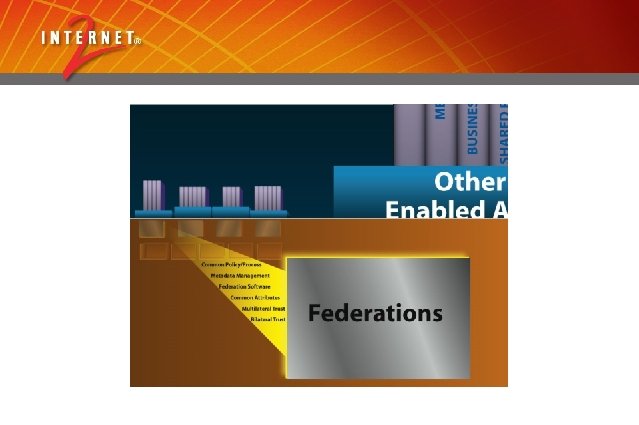 International Federations • Widespread in Europe (over 15 countries), emergent in Australia, nascent in Asia. • The UK federation (http: //www. ukfederation. org. uk/) already has over five million active users and intends to grow to all of higher ed, K-12 and further education. • Used for academic content access, research support, national level services, etc • Clear needs for peering; some need for confederation or dynamic relationships.
