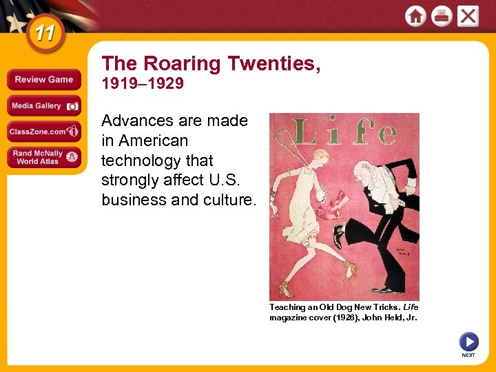 The Roaring Twenties, 1919– 1929 Advances are made in American technology that strongly affect U. S. business and culture. Teaching an Old Dog New Tricks. Life magazine cover (1926), John Held, Jr. NEXT