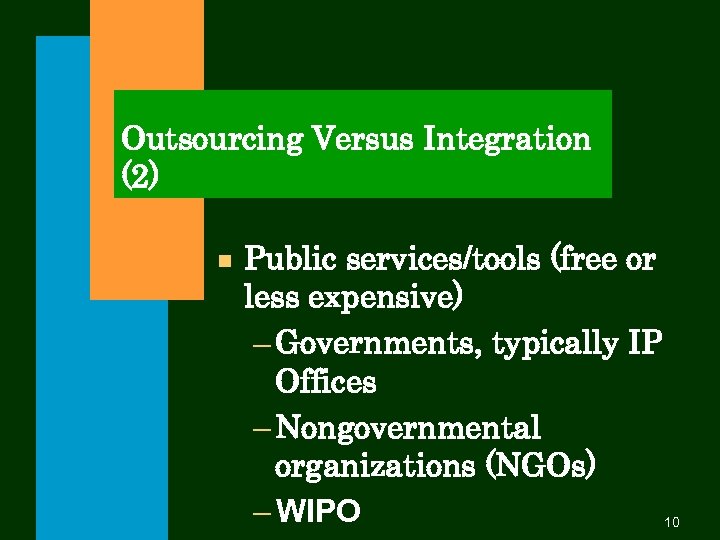 Outsourcing Versus Integration (1) n Private services (by professionals or practitioners; expensive): - Patent agents/attorneys (acquisition, enforcement) - Lawyers (Licensing, enforcement) - Consultants/Advisors (specialized in Technology, management, financing, patent marketing, patent information utilization) - Banks, Trust organizations 9