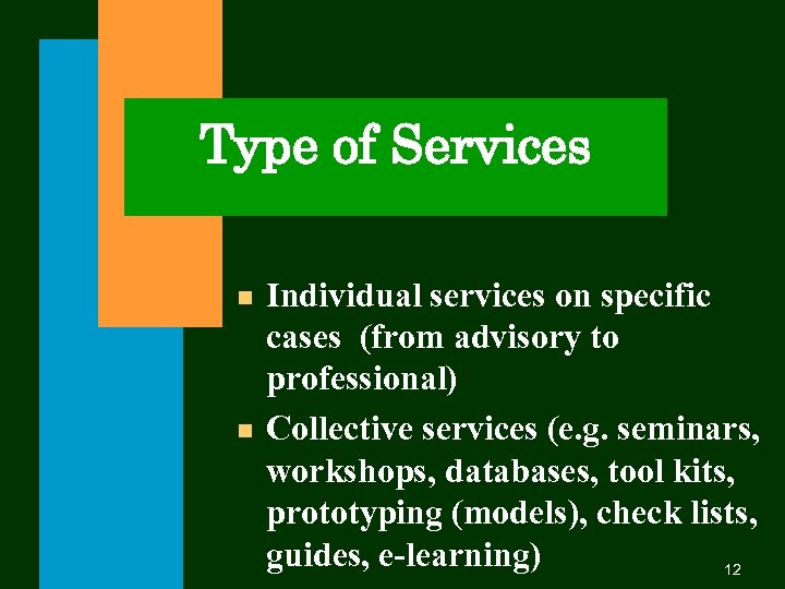 Type of Services n n Individual services on specific cases (from advisory to professional) Collective services (e. g. seminars, workshops, databases, tool kits, prototyping (models), check lists, guides, e-learning) 12