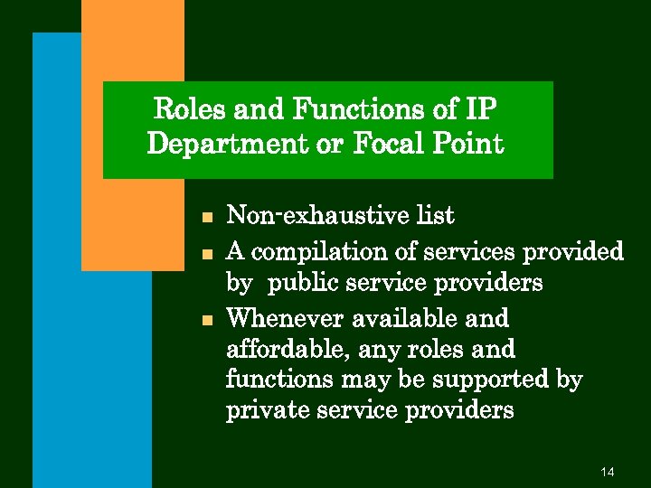 Roles and Functions of IP Department or Focal Point n n n Non-exhaustive list A compilation of services provided by public service providers Whenever available and affordable, any roles and functions may be supported by private service providers 14