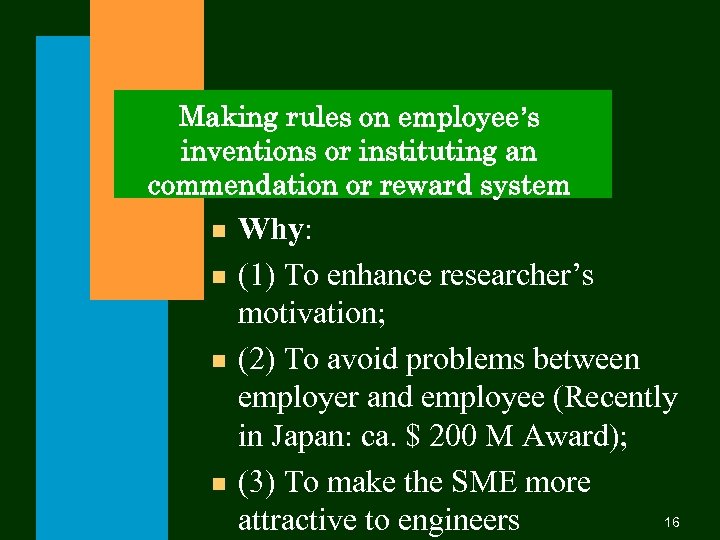 Making rules on employee’s inventions or instituting an commendation or reward system n n Why: (1) To enhance researcher’s motivation; (2) To avoid problems between employer and employee (Recently in Japan: ca. $ 200 M Award); (3) To make the SME more 16 attractive to engineers